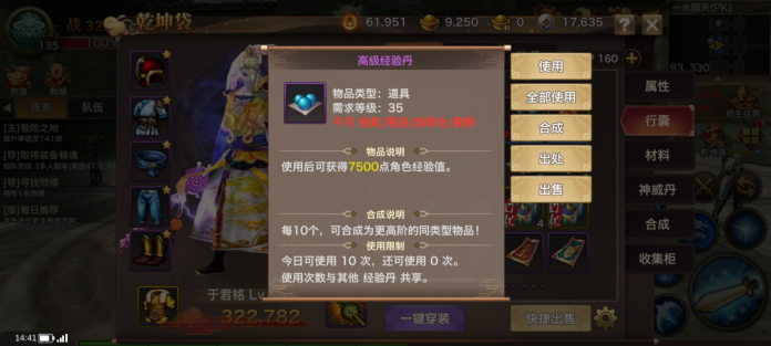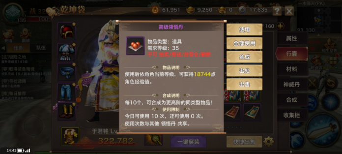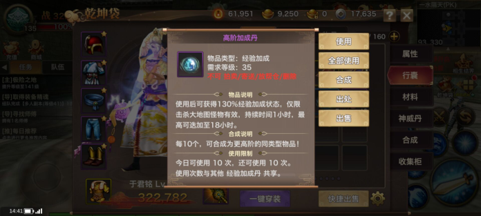 领悟丹、经验丹与加成丹,都是10个下级道具合成1个上级道具;即10个绿色合成1个蓝色,10个蓝色合成1个紫色,以此类推;